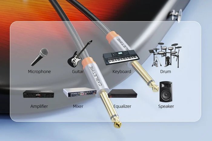 • 6.35mm TS Male to Male: Transmits unbalanced mono audio between instruments, amps, pedals, and mixers.