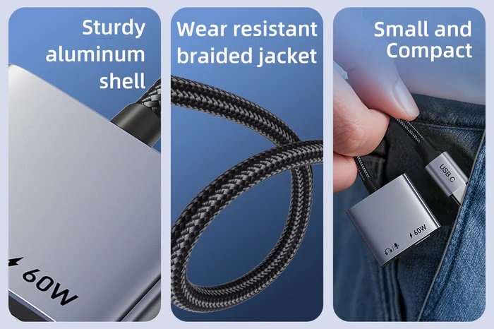 The 2 in 1 USB C to 3.5 mm audio adapter provides both charging and audio functionality in one compact design. With PD 60W fast charging, you no longer need to choose between charging your device or using your wired headphones. whether you’re on a call, gaming, or listening to music, you can keep your device powered without interruption.