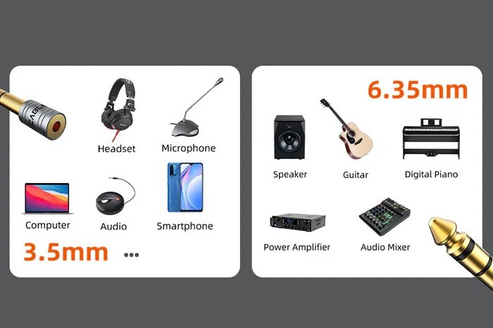 The 6.35mm jack socket is compatible with most professional audio and home audio equipment, including amplifiers, mixers, and AV receivers. The 3.5mm jack plug supports a wide range of devices like phones, tablets, laptops, and audio device.