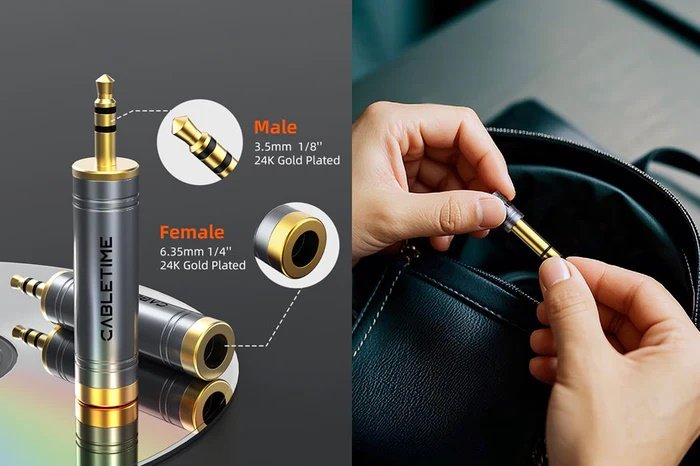CABLETIME 3.5mm Male to 1/4 Inch Female Stereo Audio Adapter offers exceptional sound quality, perfect for connecting your 3.5mm devices to amplifiers, headphones, or other audio equipment with a 1/4 inch (6.35mm) input. The 24K gold-plated connectors enhance conductivity, ensuring a crisp, clear, and uninterrupted sound experience. Its durable aluminum shell offers superior protection against wear and tear, making it ideal for both professional and everyday use. The adapter’s plug-and-play design allows for easy, hassle-free connections without the need for additional software or drivers. Its compact, lightweight construction makes it portable, so you can take it anywhere. Whether you’re a musician, audio professional, or enthusiast, this adapter delivers top-tier performance and durability to elevate your audio experience.