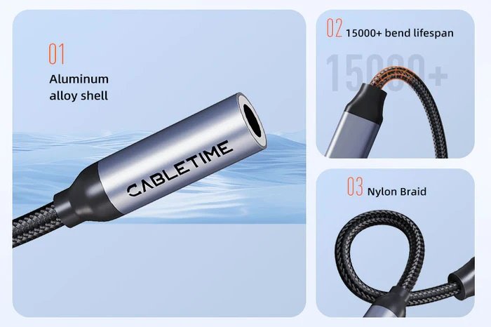 CABLETIME USB-C to 3.5mm audio adapter lets you enjoy wired headphones and microphones on your USB-C phone, tablet, or laptop. The built-in DAC chip ensures rich, clear sound, while volume, playback, and mic controls keep you in charge. Slim, tough, and ready for everyday use.
