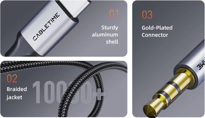 CABLETIME USB C to 3.5mm Audio Aux Jack Cable is your ultimate solution for high-quality sound on the go. Whether you’re connecting your iPhone 16 Pro Max to your car stereo, headphones, or portable speaker, this cable ensures a premium audio experience. With a sleek aluminum alloy shell, a flexible braided jacket, and gold-plated connectors, it’s built for durability and long-lasting performance. The integrated DAC chip enhances sound clarity by reducing distortion, while the plug-and-play design makes it effortless to enjoy music, podcasts, or navigation in seconds. No matter where you are, this USB C to 3.5mm jack cable ensures a flawless, immersive sound experience every time.