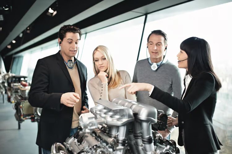 Group of people using Sennheiser headsets during a guided tour.