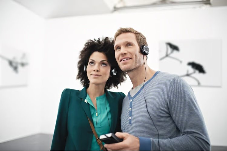 Couple using Sennheiser audio guide in an art gallery.