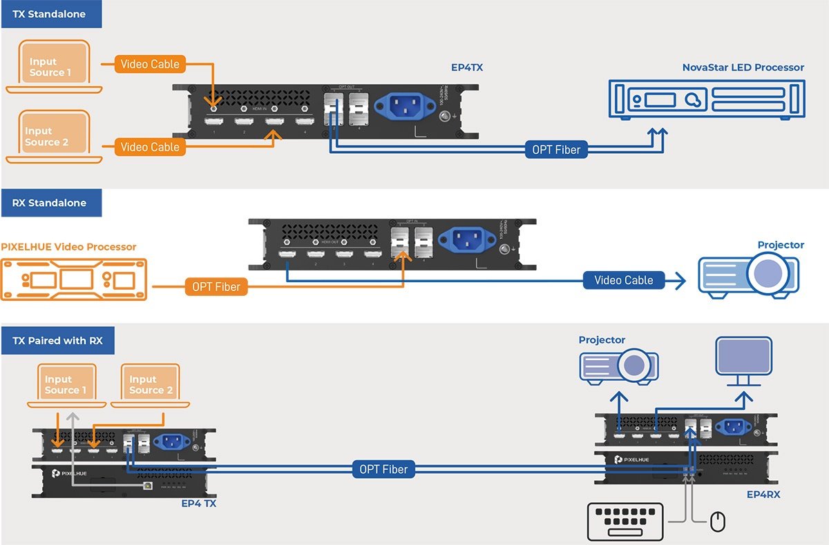 The Pixelhue EP4T is a high-performance fiber optic video transmitter/extender designed to send 4K Ultra HD video and audio signals over long distances using optical fiber cables. It’s widely used in professional AV installations, broadcast studios, large-scale events, digital signage, monitoring centers, and conference systems where traditional copper HDMI/SDI cables cannot reach or maintain signal quality over long runs.