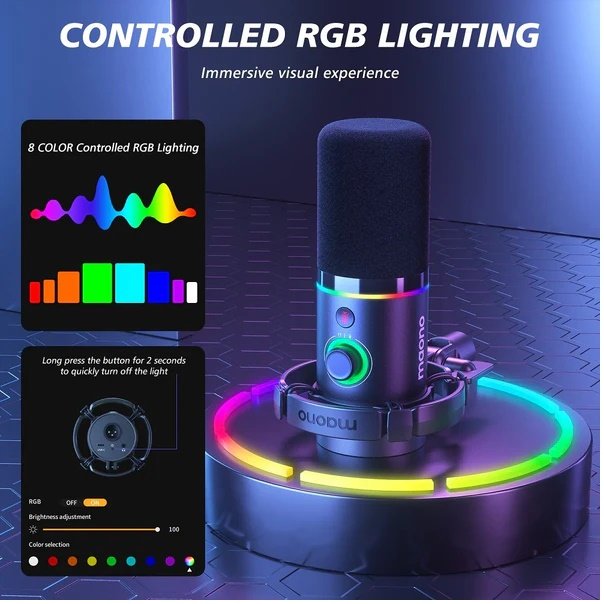 The built-in LED displays the microphone’s gaming operating status, even in the dark. With a one-key mute function, you can instantly silence the mic during streaming or podcasting. The large gain knob allows precise mic gain adjustments, letting you clearly hear FPS game footsteps in real time or through connected headphones.